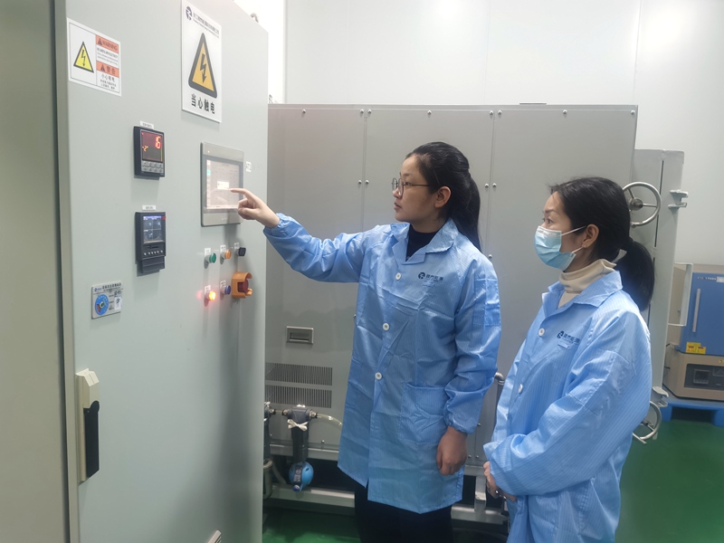 工作中的省人大代表、臻泰能源電芯事業部主管張桂敏(左)。受訪者供圖