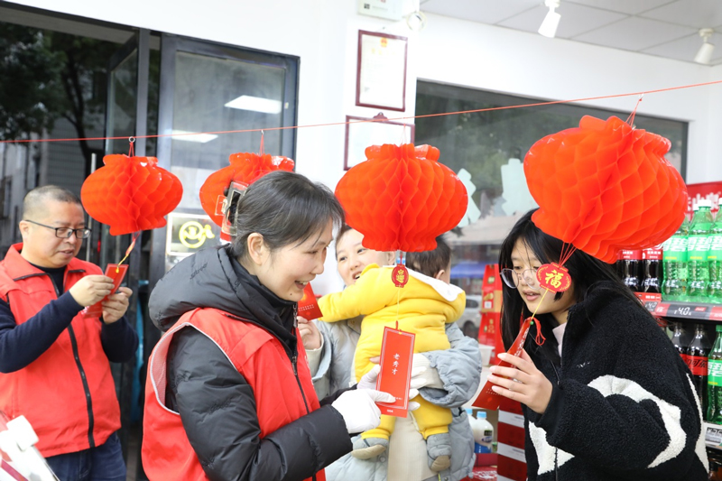 在“律動”普法志愿者的精心布置下,臺州一零售戶王莉軍店里的燈籠高高掛起,彩色的燈謎卡片輕搖擺動,滿滿的節日感引來了周邊群眾的駐足圍觀。