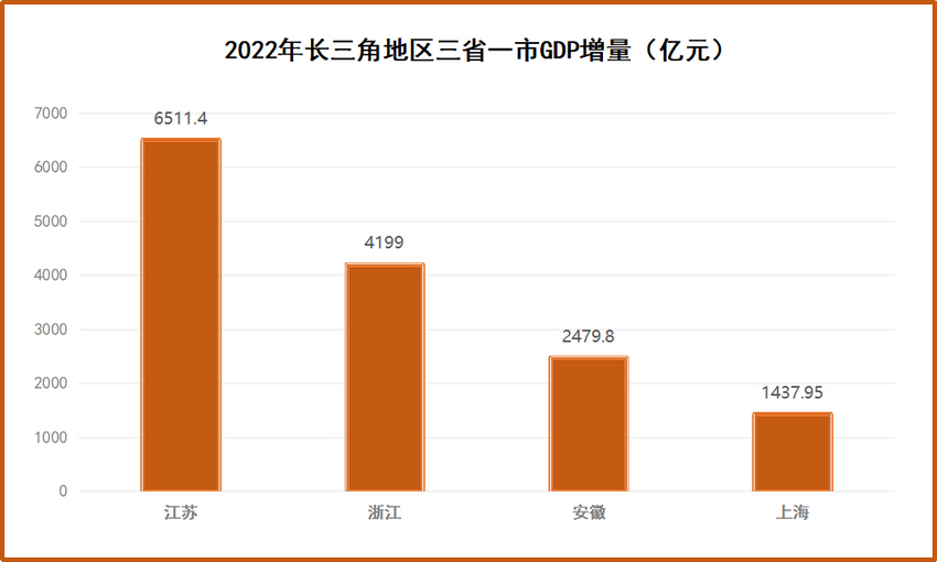 江蘇省5市登上長三角2022年GDP增量前十榜單,分別為蘇州市、無錫市、常州市、南京市、鹽城市;浙江省4市上榜前十,分別為寧波市、杭州市、紹興市、溫州市;安徽省合肥市上榜前十。