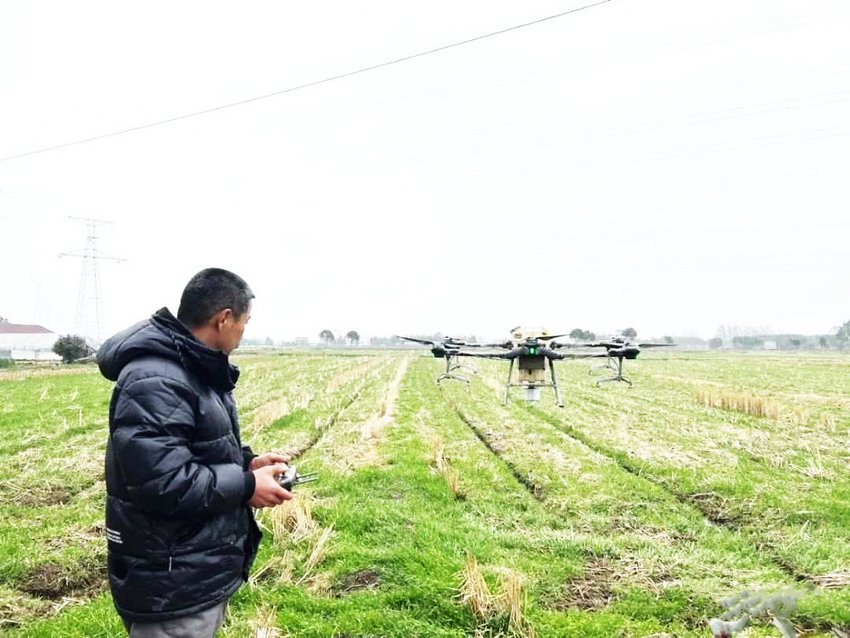 海鹽華星農場負責人許玉君正操縱一臺無人植保機在田間穿梭作業。浙江省農業農村廳供圖