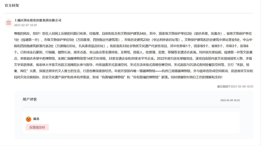 清河坊是杭州唯一保存較為完好的舊城區,也是杭州著名的文化旅游街區。在“領導留言板”,杭州市上城區國有投資控股集團有限公司對該條留言作出回復,他們對清河坊可看、可玩、可欣賞的文旅內容進行了詳細梳理。目前,該街區共有文物保護建筑34處,其中,國家級文物保護單位2處(胡慶余堂、鳳凰寺),省級文物保護單位1處(錢塘第一井),市級文物保護單位5處(方回春堂、四拐角近代建筑等),市級歷史建筑23處(亨達利鐘表舊址等)。