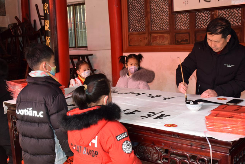 在講臺上默默耕耘了40多年的他,雖然已經退休,但依舊心系家鄉、關心下一代。當天,他回到自己家鄉,結合牌門村的書法特色向孩子們講述黨的歷史、傳授做人做事的道理。