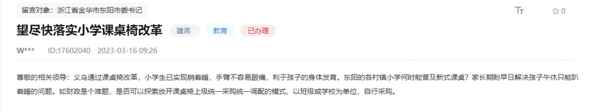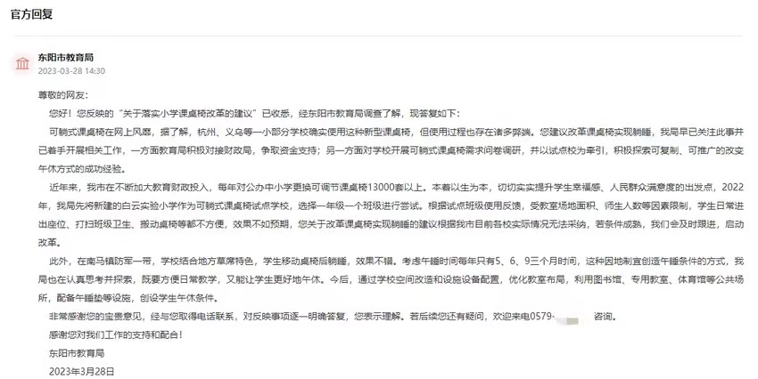 傾聽群眾呼聲,回應群眾關切。在收到網友的留言后,東陽市教育局第一時間進行了回復?!澳ㄗh改革課桌椅實現躺睡,我局早已關注此事并已著手開展相關工作”。