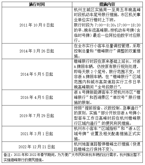 杭州的限行政策,可以追溯到2011年。2011年10月8日起,為緩解交通“行路難、停車難”問題,針對工作日早晚高峰時段,杭州在主城區開始實行限行政策。隨后,限行政策又經過幾輪調整,如2014年3月26日起,杭州在全市實行小客車總量調控措施,同時采取控制總量和“錯峰限行”調整的雙重措施;2019年7月29日起,杭州部分開放非浙A號牌小型客車工作日高峰時段在限行區內通行,每輛非浙A號牌的小型客車在一個自然年度內,允許通行的次數不超過12次(2019年為6次);2022年12月21日開始,杭州市區地面道路暫停錯峰限行。