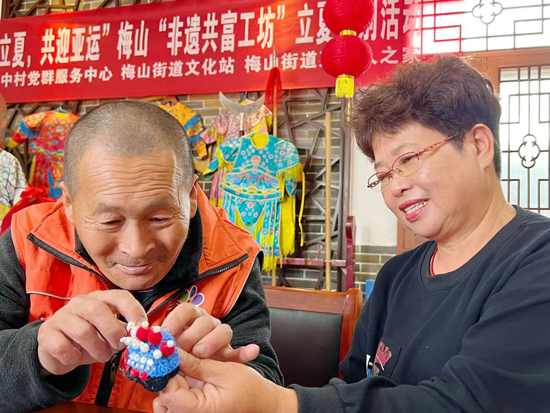 此次活動由梅中村黨群服務中心聯合梅山街道文化站、殘疾人之家共同舉辦?!靶南嗉s 夢閃耀”是杭州亞殘運會主題口號。而此次的立夏特別活動也邀請了梅山殘疾人之家的10位托養人員。同時,考慮到手工針線活的安全問題,活動還邀請了梅中村婦女與托養人員一一結對,兩人一組協作進行活動。