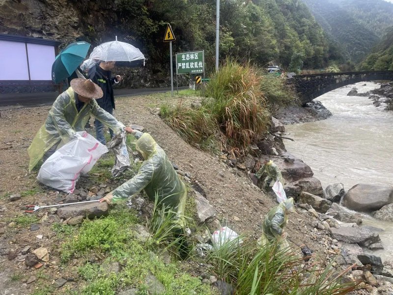 在安豫線庵邊路口處,龍南鄉工作人員和塢坑村村兩委根據提前摸排的點位,把公路沿線及河道邊上的生活垃圾、建筑垃圾一清而空?!敖窈笪覀円矊⒊掷m關注沿線道路和河道的環境,堅決保護百山祖國家公園的綠水青山不受污染?!饼埬相l塢坑村村兩委負責人說。