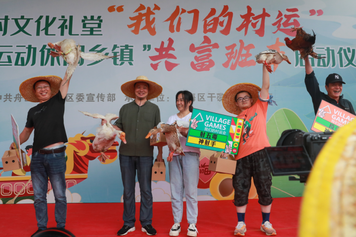 在一片熱烈的鼓掌聲中,定海區農漁村文化禮堂“我們的村運”干覽站順利結束,其中龍潭村文化禮堂隊、青龍村文化禮堂隊、西碼頭村文化禮堂隊分別斬獲冠軍、亞軍與季軍。而在個人賽中獲得一等獎的村民也拎著雞鴨鵝等獎品,滿載著勝利的果實,歡歡喜喜地拍照合影。