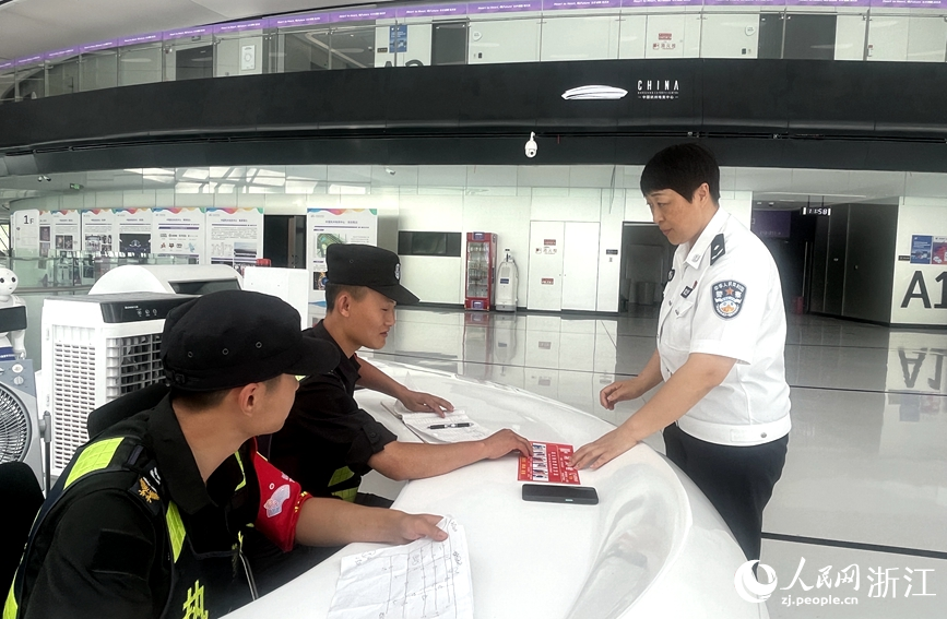 李怡文與執勤人員溝通消防注意事項。人民網記者 張麗瑋攝