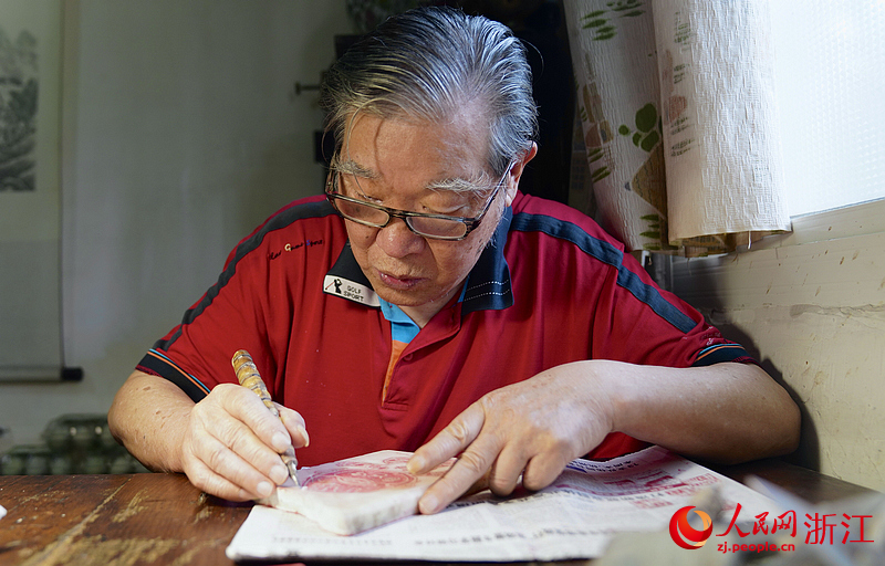 一張老式木桌、一盞昏黃臺燈,再加上幾把自制的篆刻小刀,在杭州市西湖區北山街道友誼社區居民楊云浩的“工作室”里誕生了一枚枚精致的篆刻作品。