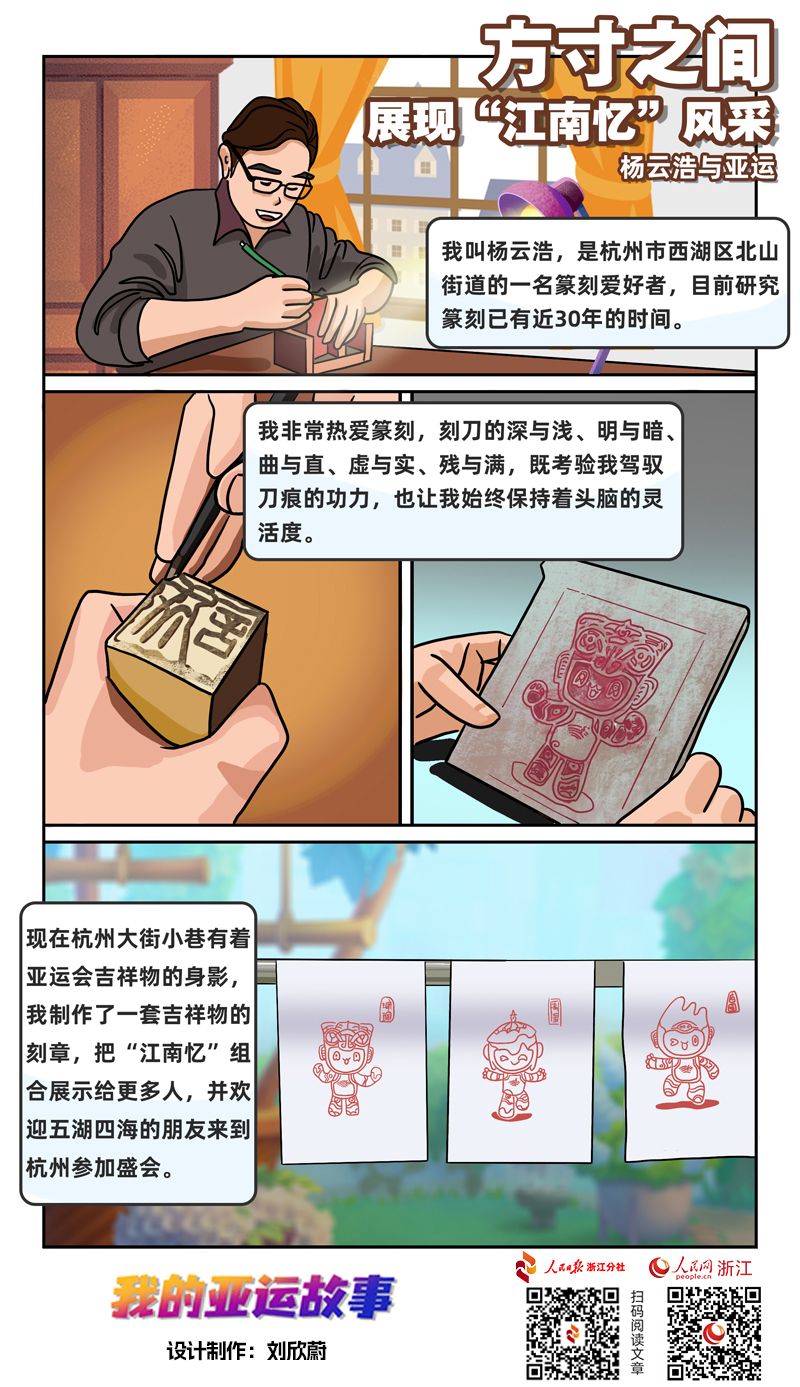 “今年剛好是亞運年,希望通過自己的作品,讓亞運會的氛圍再濃厚一點?!睏钤坪聘嬖V記者,2022年以來,他開始創作以杭州亞運會吉祥物為主題的系列篆刻作品——“琮琮”“蓮蓮”“宸宸”,取名“江南憶”印章,以此獻禮亞運?!耙蚕M约旱綍r候能到現場,為中國運動員加油?!睏钤坪普f。