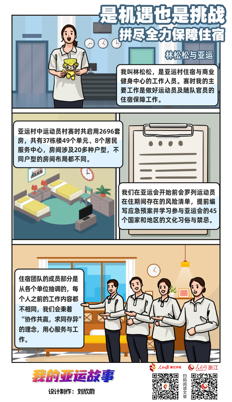亞運村是杭州亞運會最大的非競賽場館,也是運行持續時間最長、運行連續性要求最高、服務對象最多的地方,作為住宿與商業健身中心工作人員,林松松身上的重擔不言而喻,接下來,她將和團隊成員一起,用心服務,做好運動員及隨隊官員在亞運村的住宿保障。
