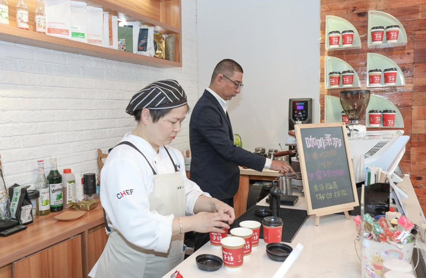 “您好,您的咖啡做好了,請品嘗?!薄昂蔀场づА眱?,聽障人士吳靜霞用手熟練地表達,顧客們也用手語道謝。