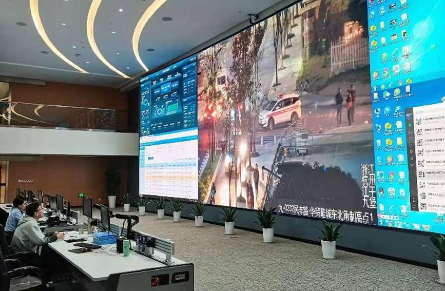 “請附近隊員立即前往處理?!卞X海剛通過對講機傳達要求。不一會兒,執勤人員來到事發地,現場處置的實時畫面同步出現在大屏上。