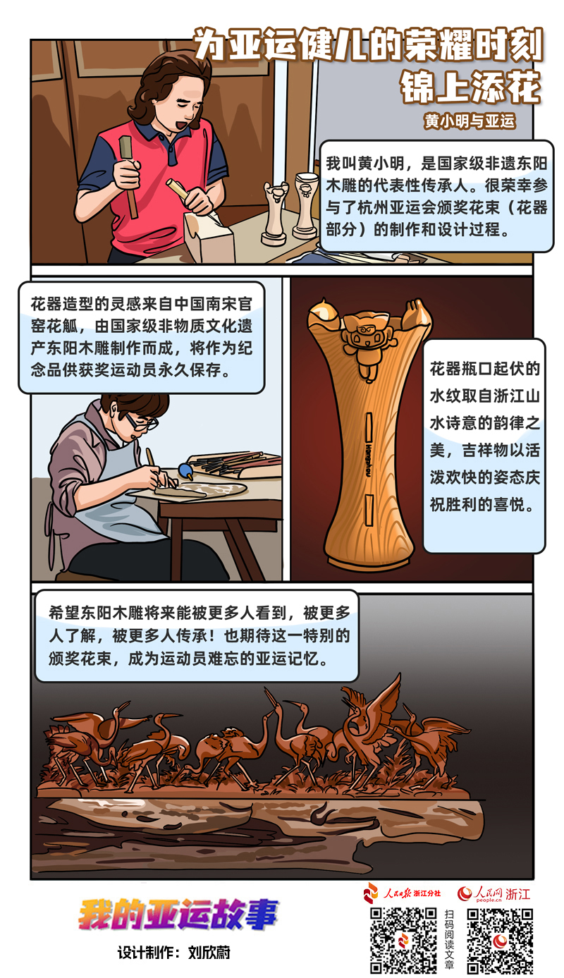 “東陽木雕作為中國四大傳統木雕之一,被杭州亞組委選中成為花器制作工藝,讓頒獎花束從一束簡單的鮮花變成了一個可以永久保存珍藏的紀念品。同時,它也承載了浙江作為工藝美術強省的傳統文化技藝?!弊罱K定稿前,黃小明先后設計了十幾版方案,有立體吉祥物、小臺屏等,最終選擇將南宋官窯花觚作為造型參考。