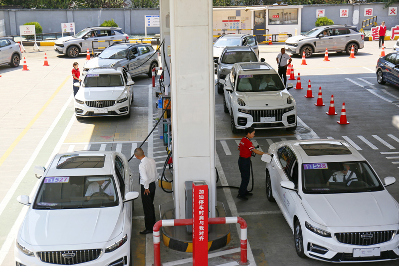 上百余輛亞運會保障用車排隊等候加油。中國石化浙江石油供圖