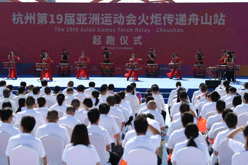 一大早,中國舟山國際水產城漁民廣場鑼鼓喧天、氣氛熱烈,舟山鑼鼓、漁民號子等本土非遺文化節目輪番上演。9時,杭州第19屆亞運會火炬傳遞舟山站起跑儀式在這里舉行。8名儀仗隊護旗手護送中華人民共和國國旗、亞洲奧林匹克理事會會旗入場,全場奏唱中華人民共和國國歌,亞洲奧林匹克理事會會歌隨后奏響。