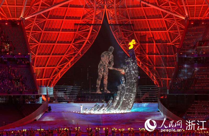 9月23日晚,在杭州第19屆亞運會開幕式上,“數字火炬手”與最后一棒火炬手汪順,共同點燃了杭州亞運會主火炬——“錢江潮涌”。人民網 章勇濤攝