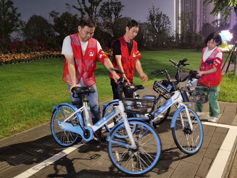 志愿者將共享單車擺放整齊。石橋街道供圖