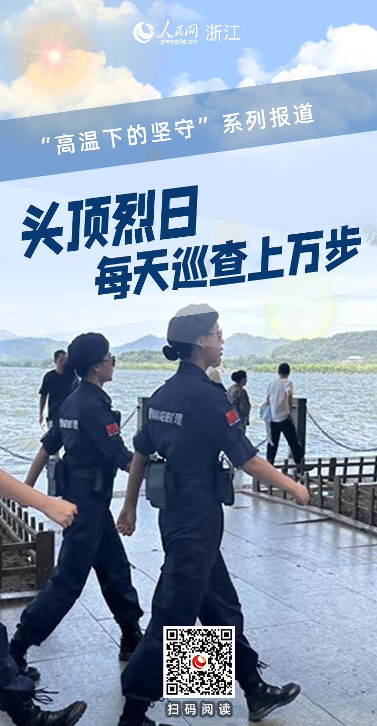 7月18日上午,杭州最高氣溫直逼39攝氏度。在杭州西湖邊,西湖女子巡邏隊正冒著烈日開展巡邏。她們一天巡邏需要步行約10公里,步數達到2萬步左右。