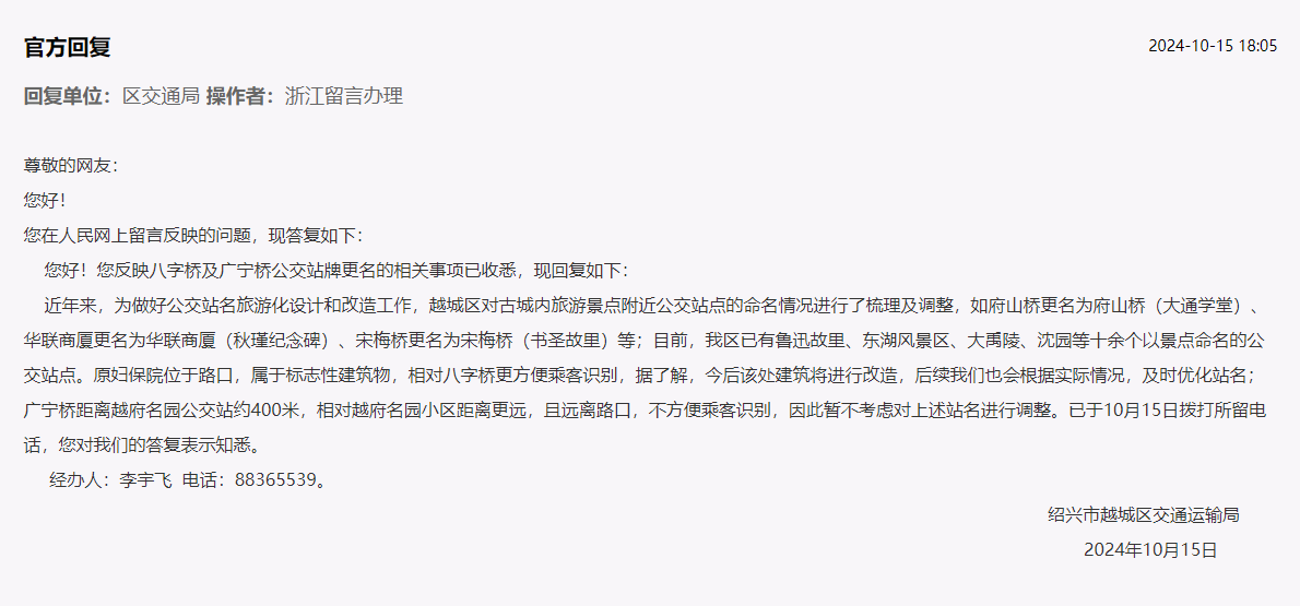 針對該網民提出的“八字橋”站名更改建議,紹興市越城區交通運輸局工作人員李宇飛進行了回復:近年來,為做好公交站名旅游化設計和改造工作,越城區對古城內旅游景點附近公交站點的命名情況進行了梳理及調整,如府山橋更名為府山橋(大通學堂)、華聯商廈更名為華聯商廈(秋瑾紀念碑)、宋梅橋更名為宋梅橋(書圣故里)等,“目前,我區已有魯迅故里、東湖風景區、大禹陵、沈園等十余個以景點命名的公交站點。原婦保院位于路口,屬于標志性建筑物,相對八字橋更方便乘客識別,據了解,今后該處建筑將進行改造,后續我們也會根據實際情況,及時優化站名?!?/p>