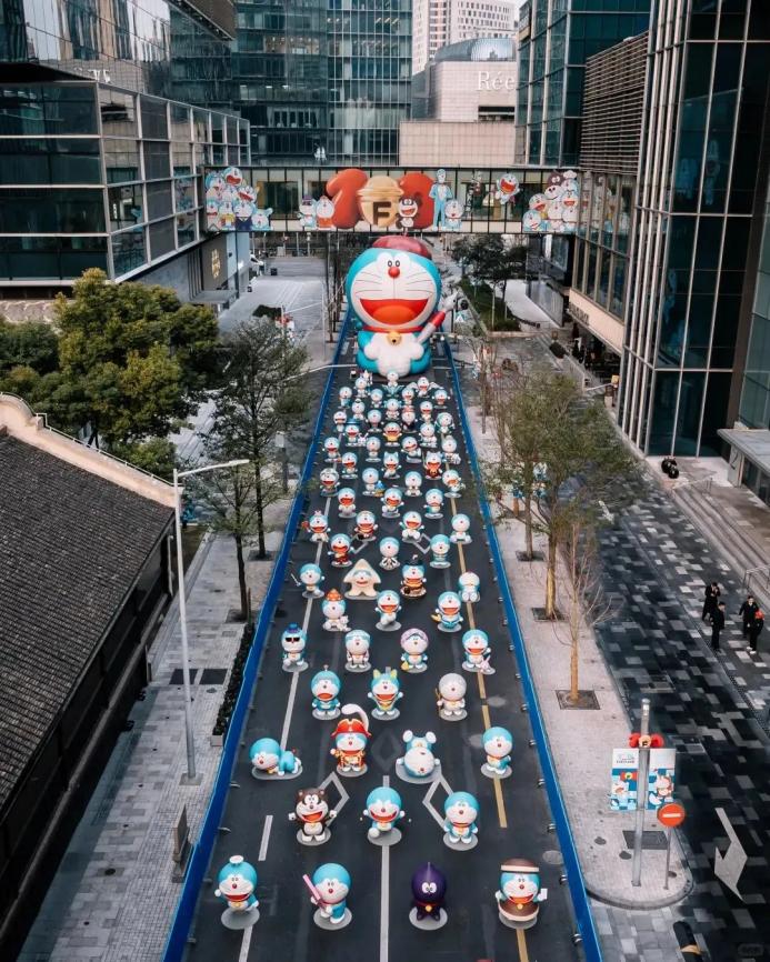 3月8日,靜安嘉里中心的哆啦A夢快閃以“百米藍毯”的視覺震撼拉開序幕。近百個哆啦A夢1:1雕塑和12米巨型充氣裝置亮相安義路,消費者紛紛趕來打卡,尋找童年的記憶。