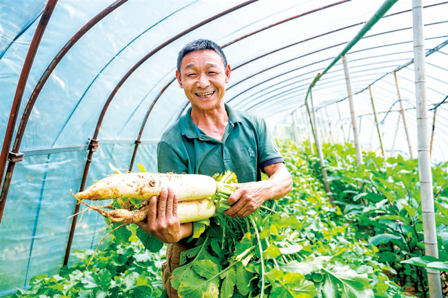 “村里農戶所種的蘿卜品種為浙蘿6號和白玉春,單個重2公斤左右,畝產值1萬多元?!北P前村黨支部書記章軍介紹,目前盤前村共有110余戶人家,有105戶以蔬菜種植為業,擁有蔬菜大棚2100余個,種植面積約2300畝,年產值約2200萬元。如今的盤前蔬菜上午采摘下午就能擺上市民餐桌,做到高山蔬菜半日達。(傅?。?/p>