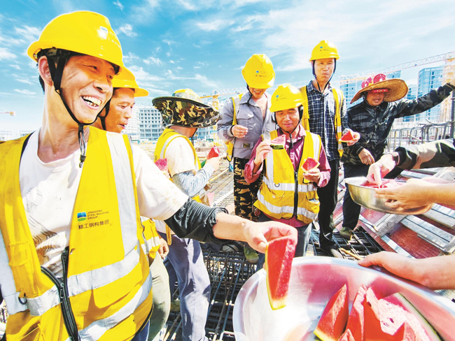 7月2日,建筑工人在紹興一處施工現場吃西瓜解暑。