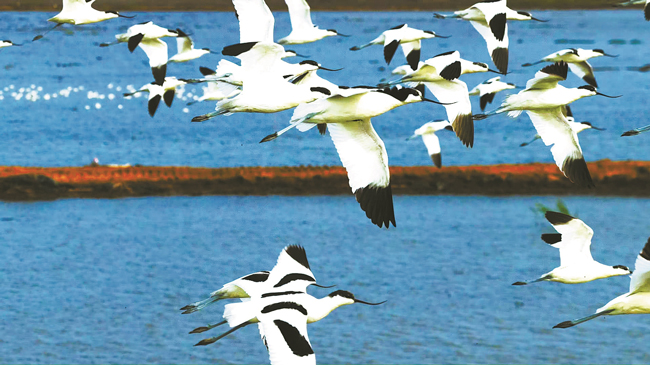 10月28日,寧波前灣新區濱海濕地上演靈動一幕:反嘴鷸、野鴨等首批南遷候鳥成群而至,成千上萬只“空中精靈”振翅翱翔,為生態新城暈染出生態底色。潔白的反嘴鷸掠過淺灘啄食底棲生物,灰褐色野鴨浮水嬉戲,群鳥起落間,與水草豐茂的濕地、澄澈的近岸水域繪就共生圖景。